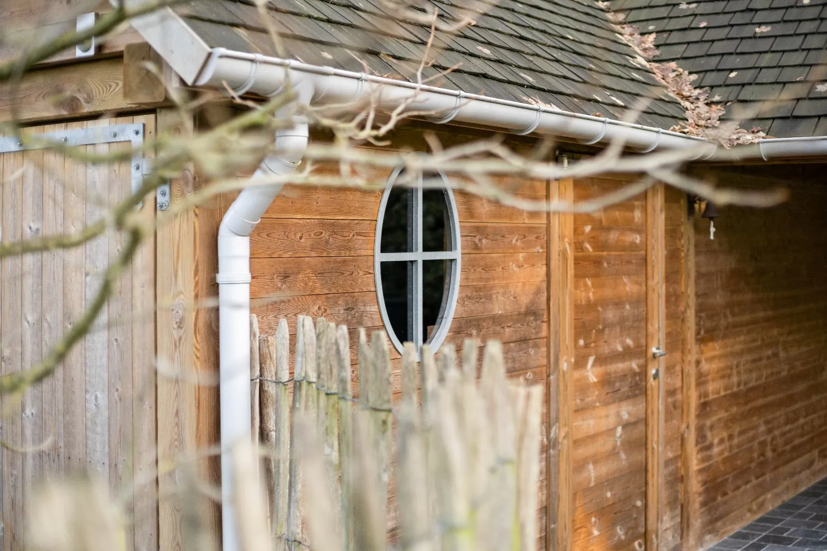 Ruime aangelegde tuin met twee bijgebouwen.