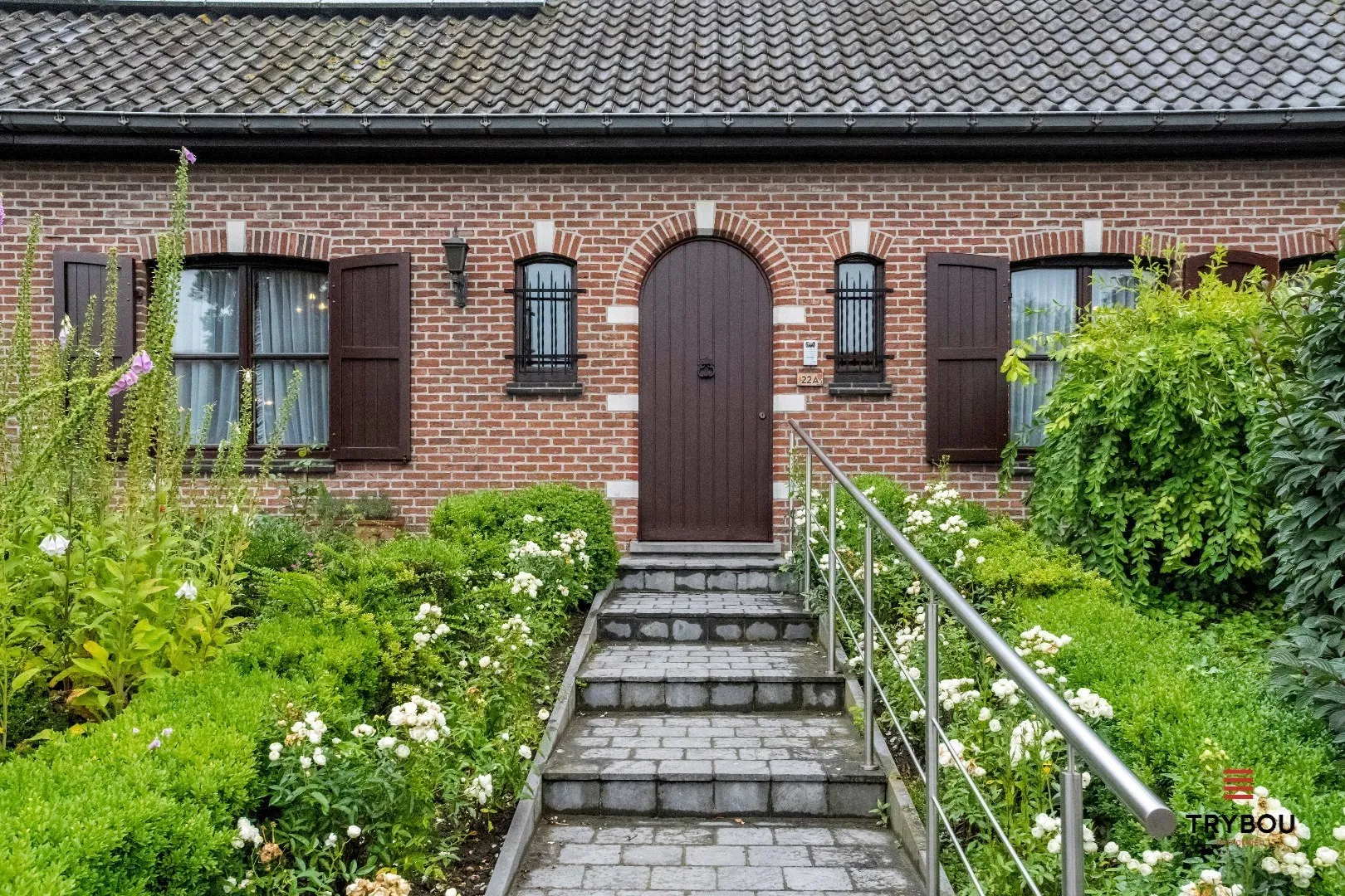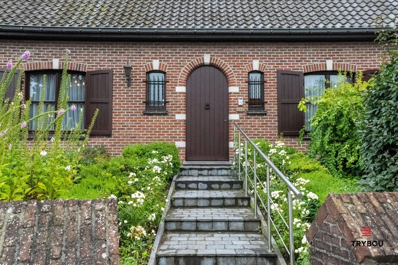 Op het gelijkvloers vinden wij een hall met gastentoilet, ruime woonkamer, aparte keuken met alle apparaten, toegang tot zonnige veranda die een doorgang geeft naar de tuin, ingerichte badkamer, twee slaapkamers en garage.
