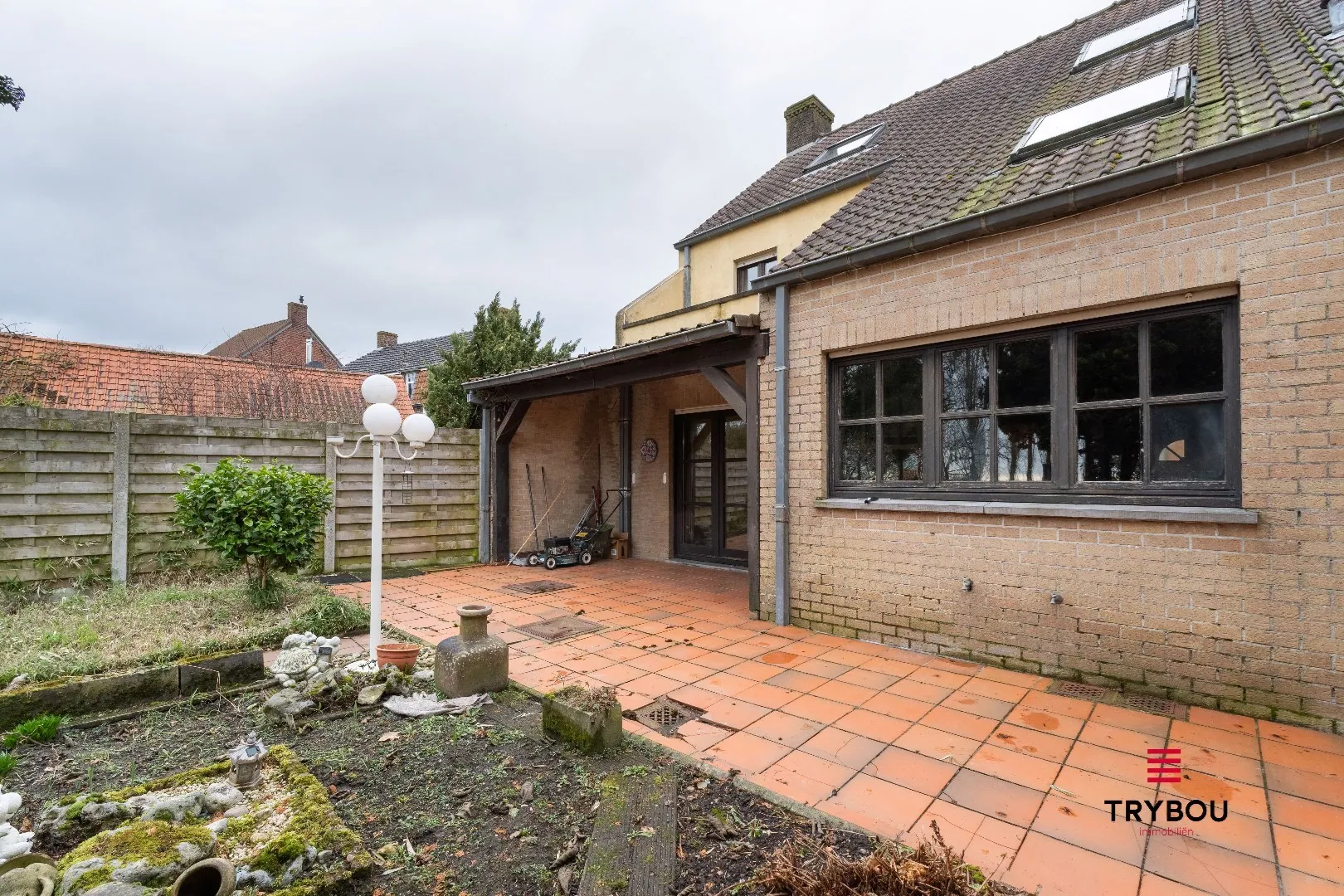 Buiten geniet je van een diepe tuin met terras en een groen uitzicht, perfect voor ontspanning of speelruimte voor kinderen.