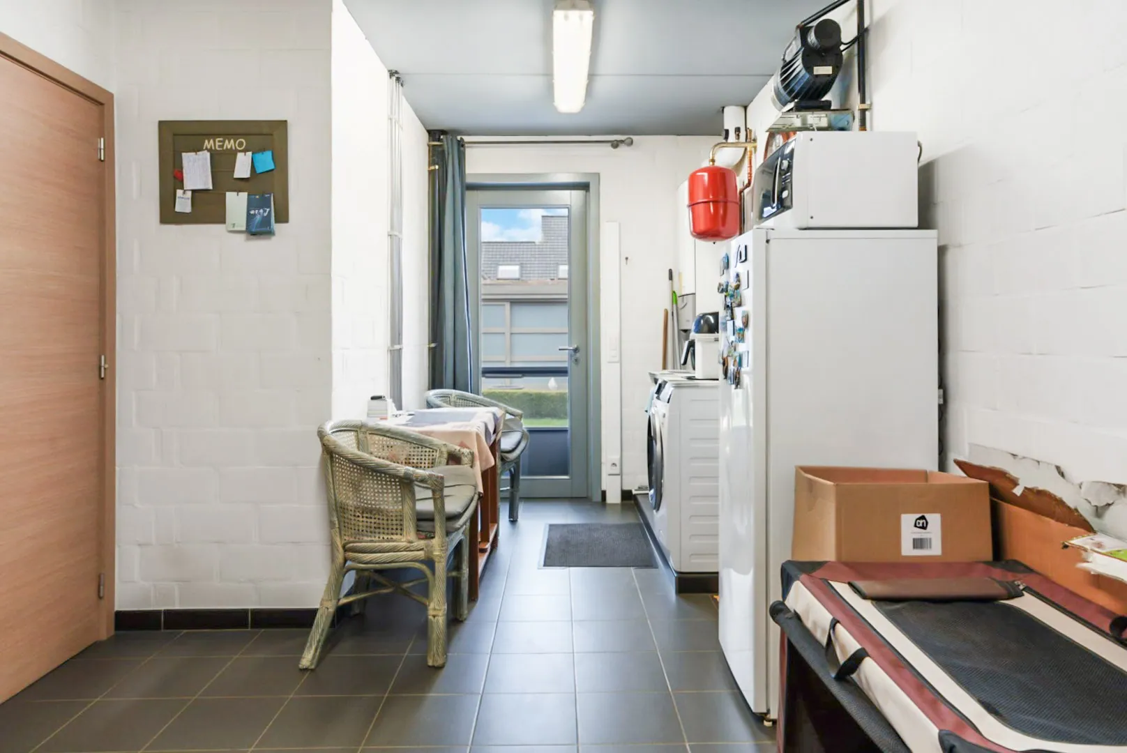 Gelijkvloers: inkomhal met gastentoilet - lichtrijke leefruimte met zit- en eethoek - uitgeruste open keuken - ruime garage - berging.