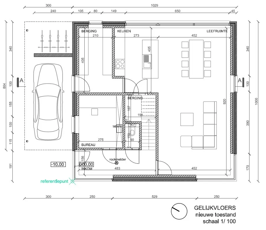 Gelijkvloers: Inkomhal met gastentoilet - bureau - lichtrijke leefruimte met open ingerichte keuken - berging - wasplaats