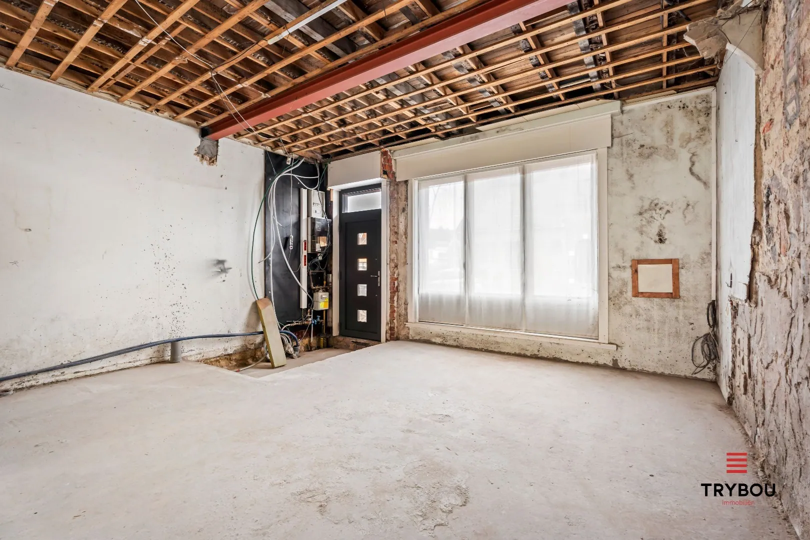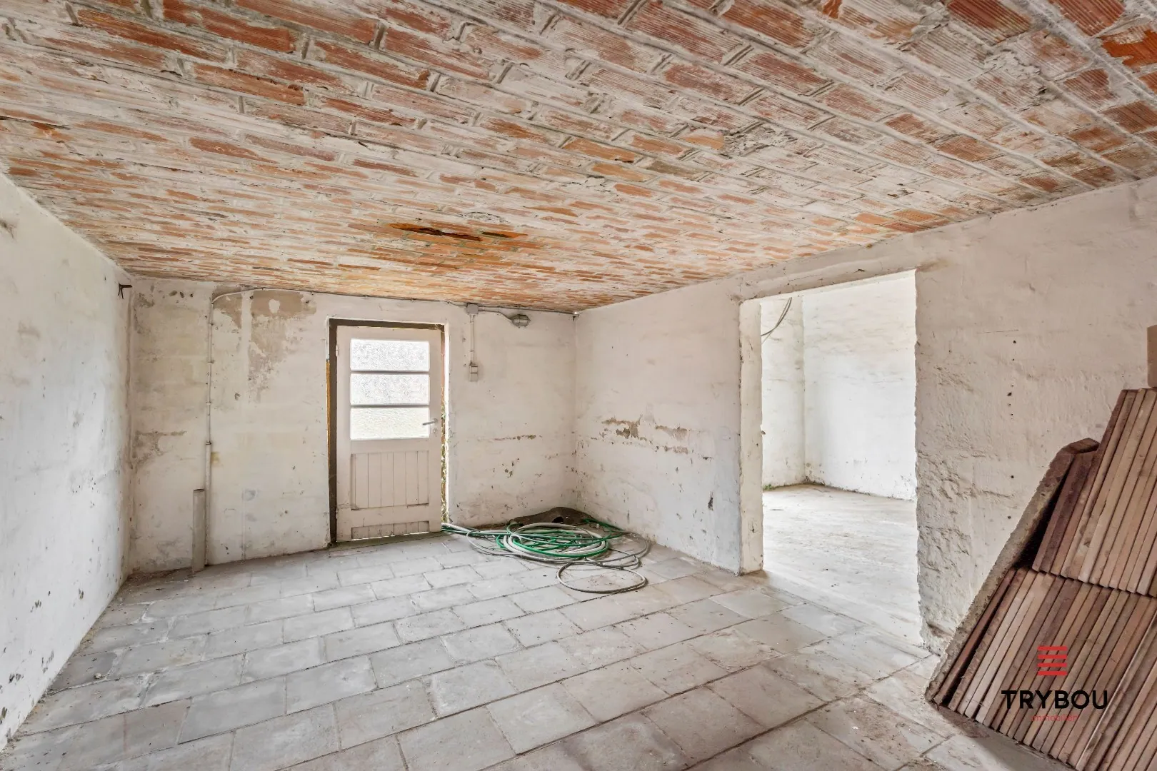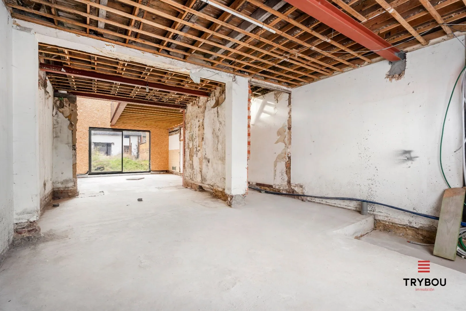 Gelijkvloers: inkomhal - bureau - ruime lichtrijke leefruimte met voorzien voor een keuken - berging - kelder.