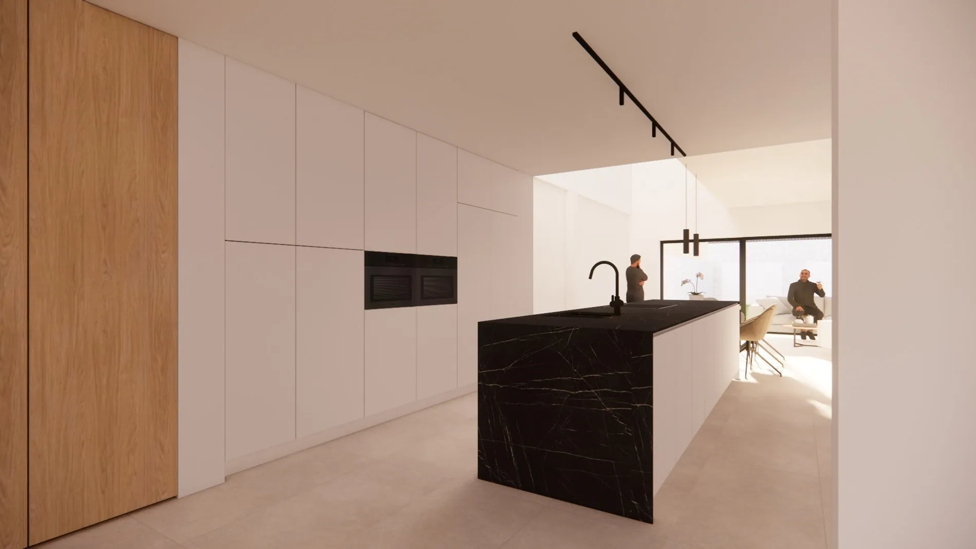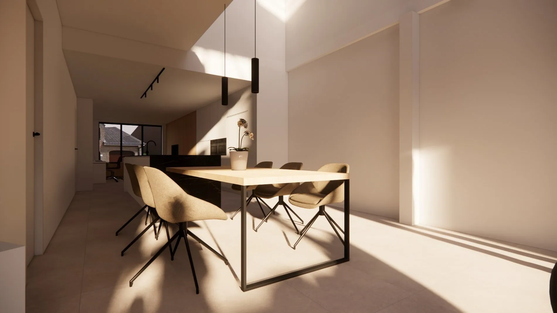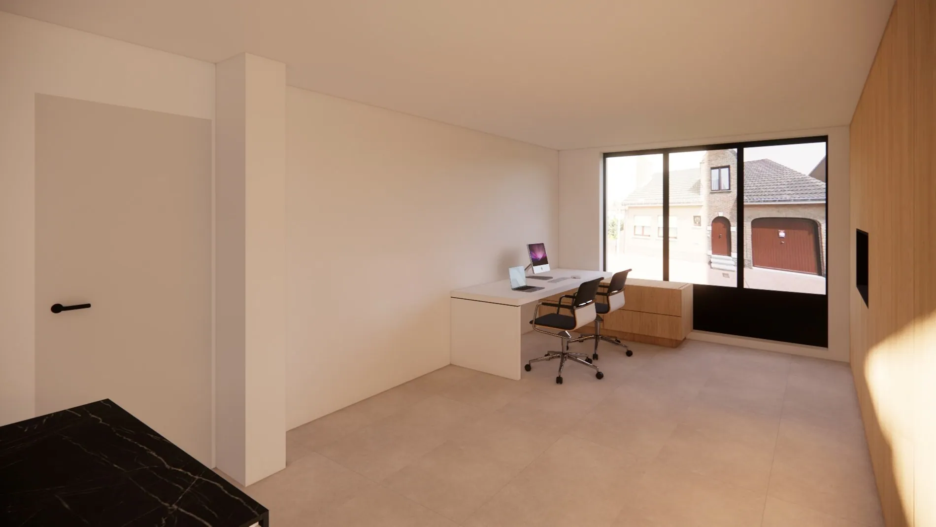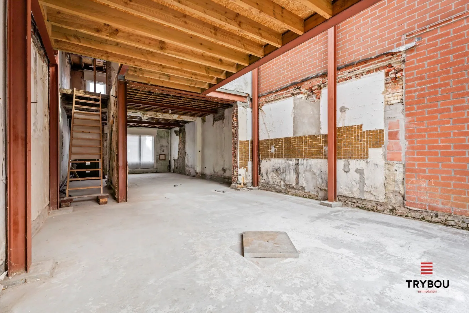 Gelijkvloers: inkomhal - bureau - ruime lichtrijke leefruimte met voorzien voor een keuken - berging - kelder.