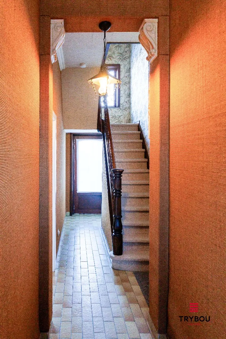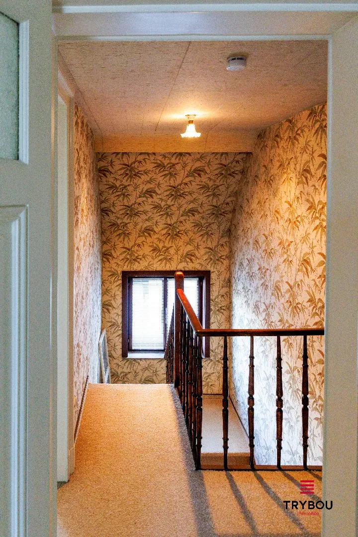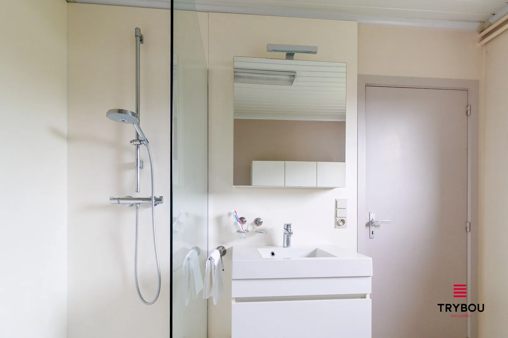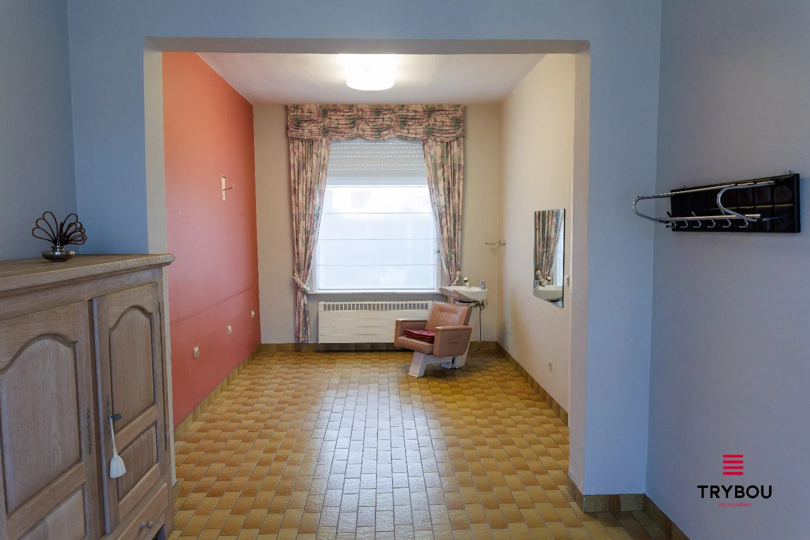 Gelijkvloers: inkomhal met trap naar verdiep - twee ruime woonkamers of extra ruimte voor vrij beroep - recentelijke keuken - aansluitende berging voorzien van douche en lavabo meubel - tuin voorzien van berging en ruim terras.