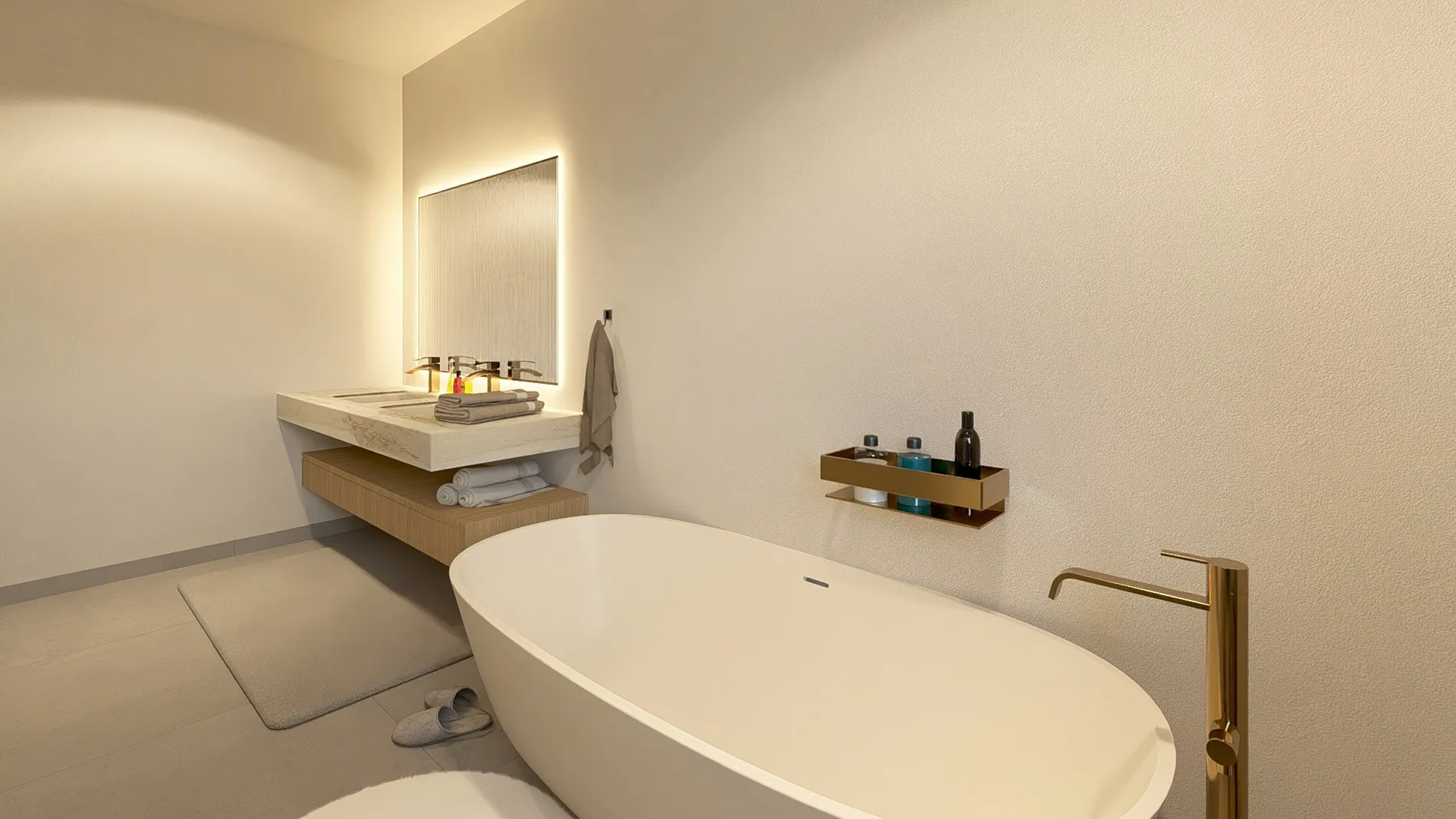 - Luxueuze badkamer met vrijstaand bad en verfijnde afwerking.