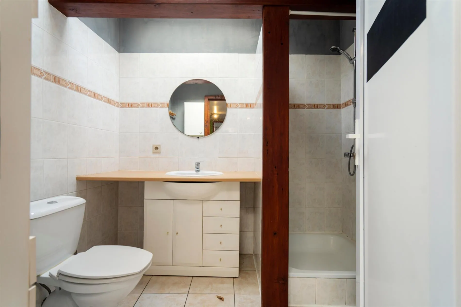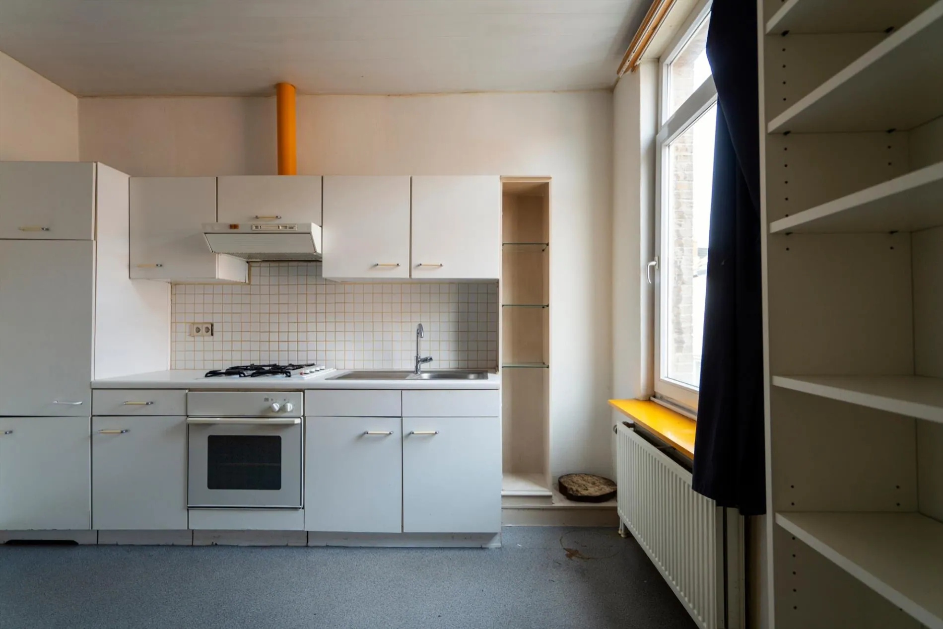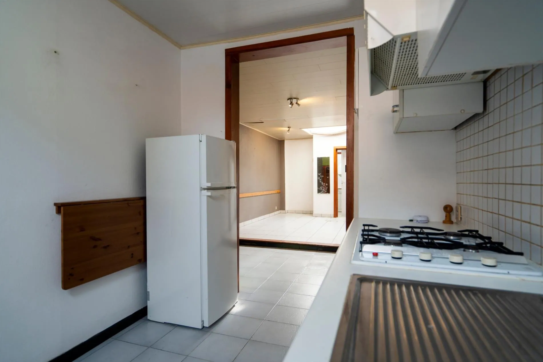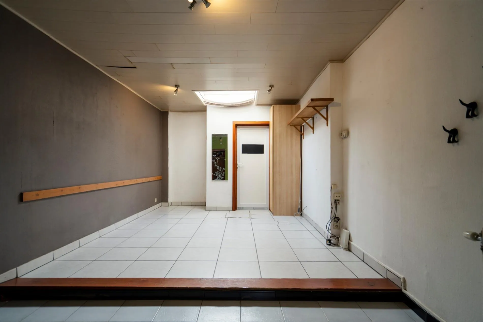 De studio op het gelijkvloers heeft een keuken, een leefruimte en een badkamer.