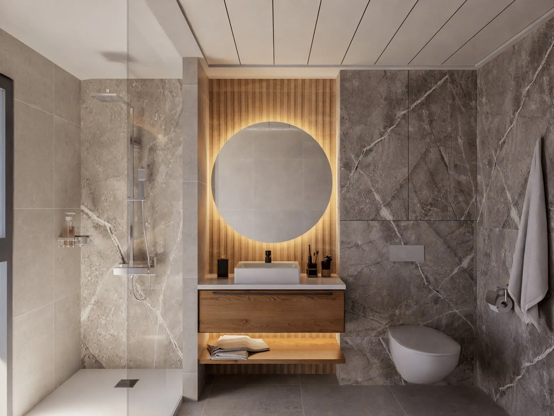 Volledig ingerichte badkamers met ingebouwde wastafel, meubel, spiegel en verlichting, en douche met scherm.