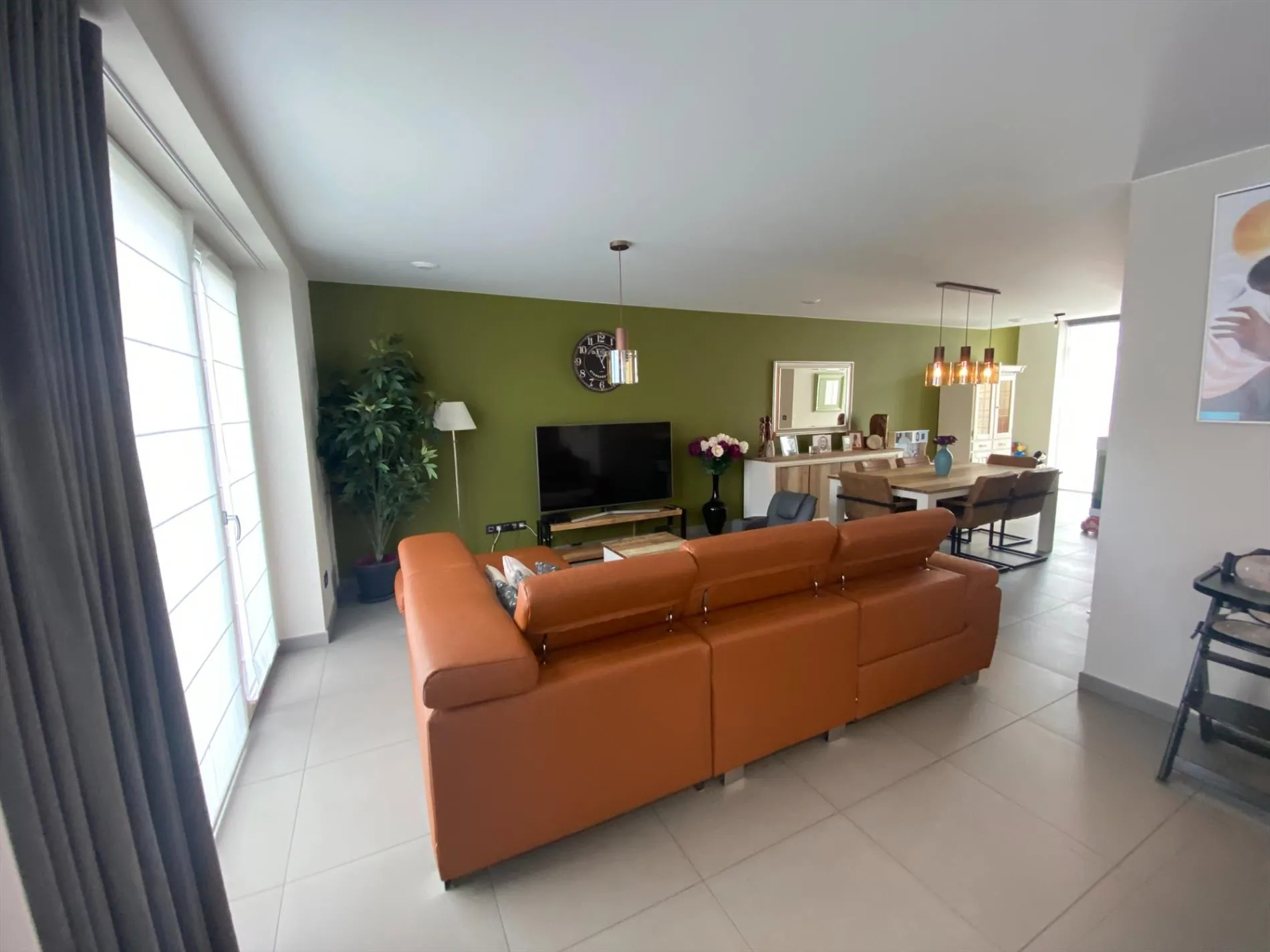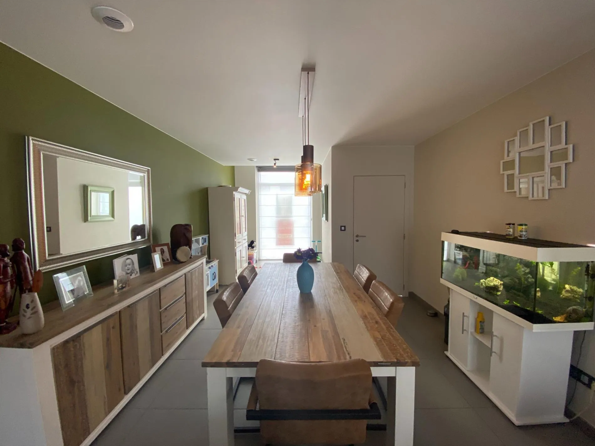 Gelijkvloers: Inkomhal met gastentoilet - ruime lichtrijke leefruimte met aansluitende open keuken (voorzien van alle toestellen), berging, ruime garage