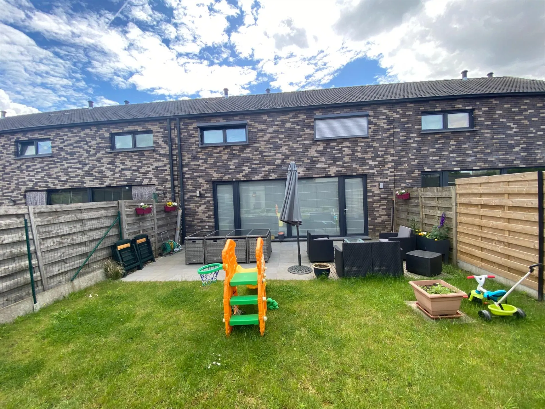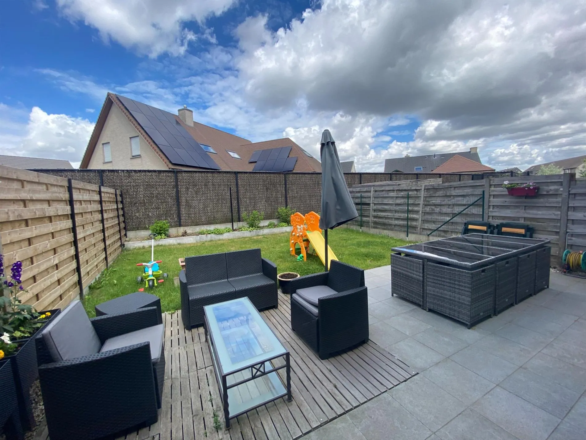 Zonnige, onderhoudsvriendelijke tuin met terras.