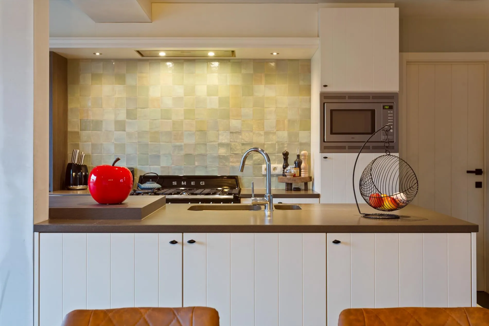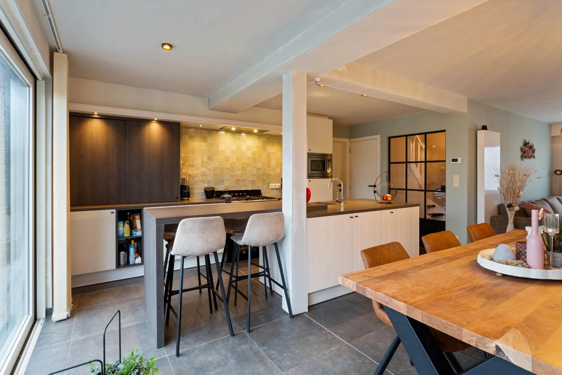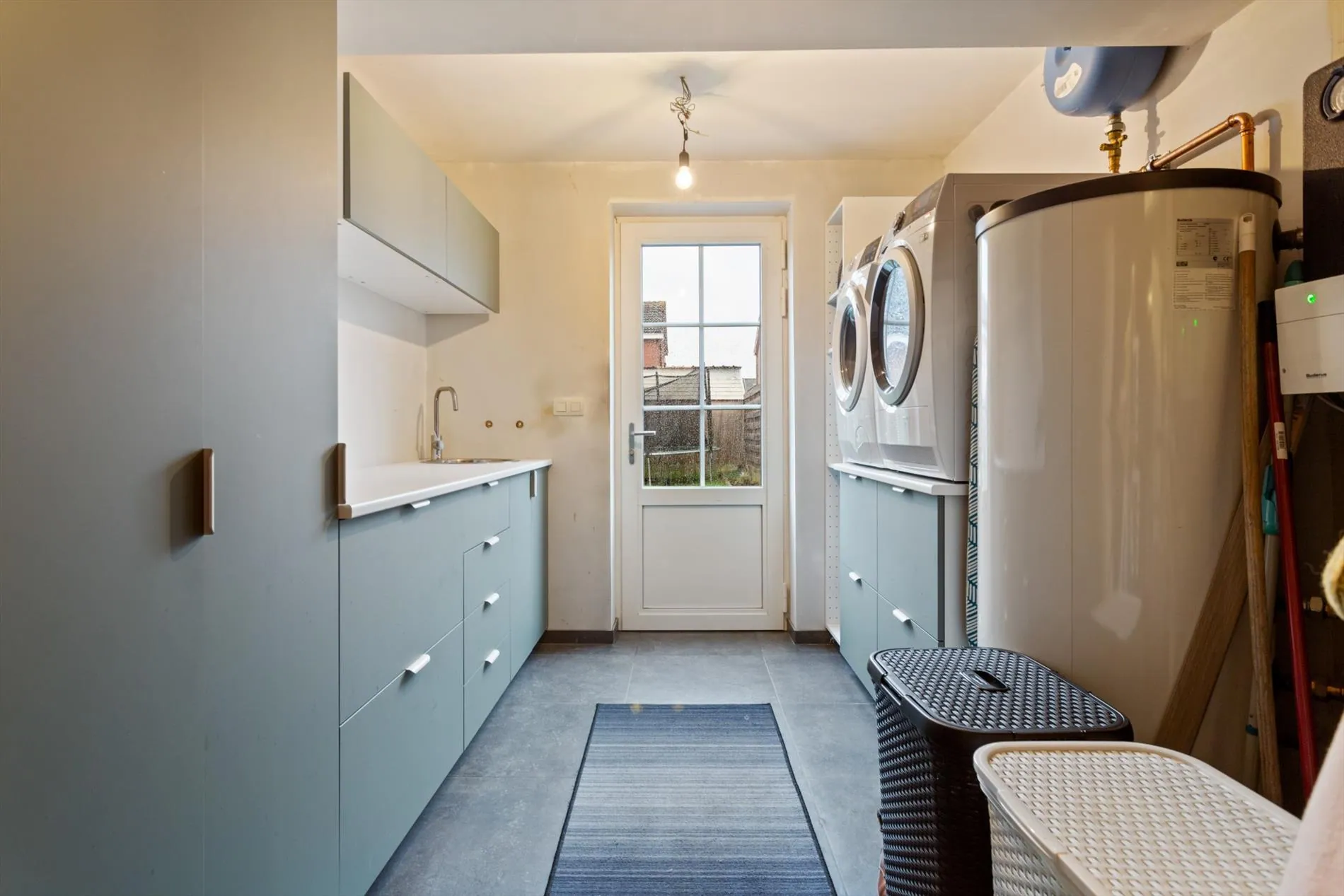 Gelijkvloers: inkomhal met gastentoilet - lichtrijke leefruimte met open, volledig ingerichte keuken - garage met wasplaats