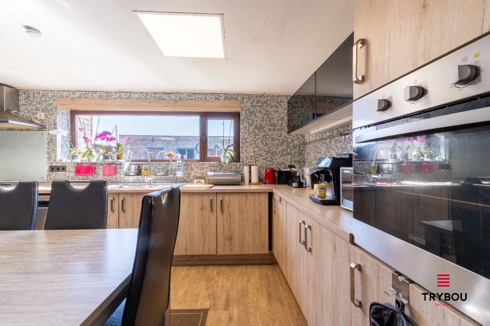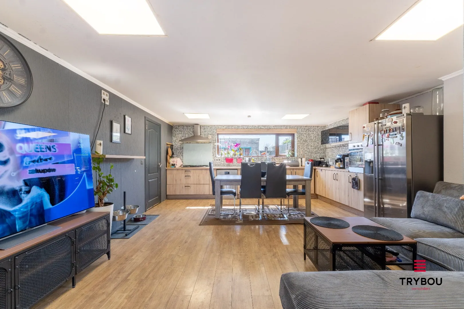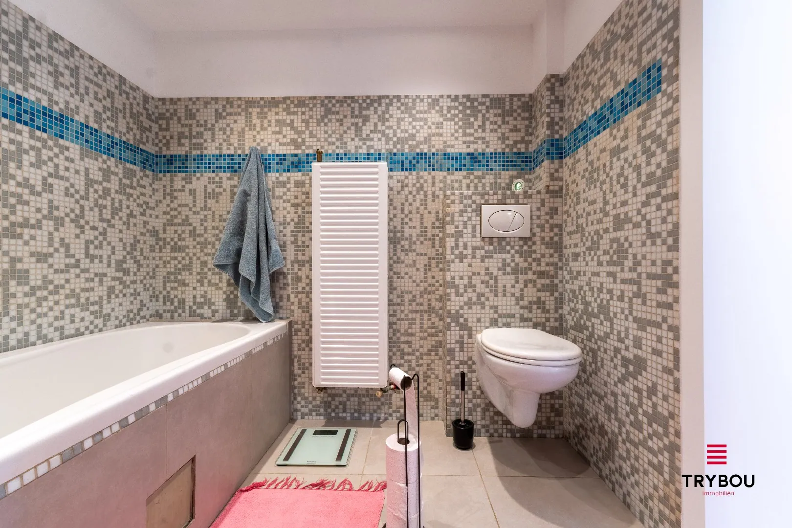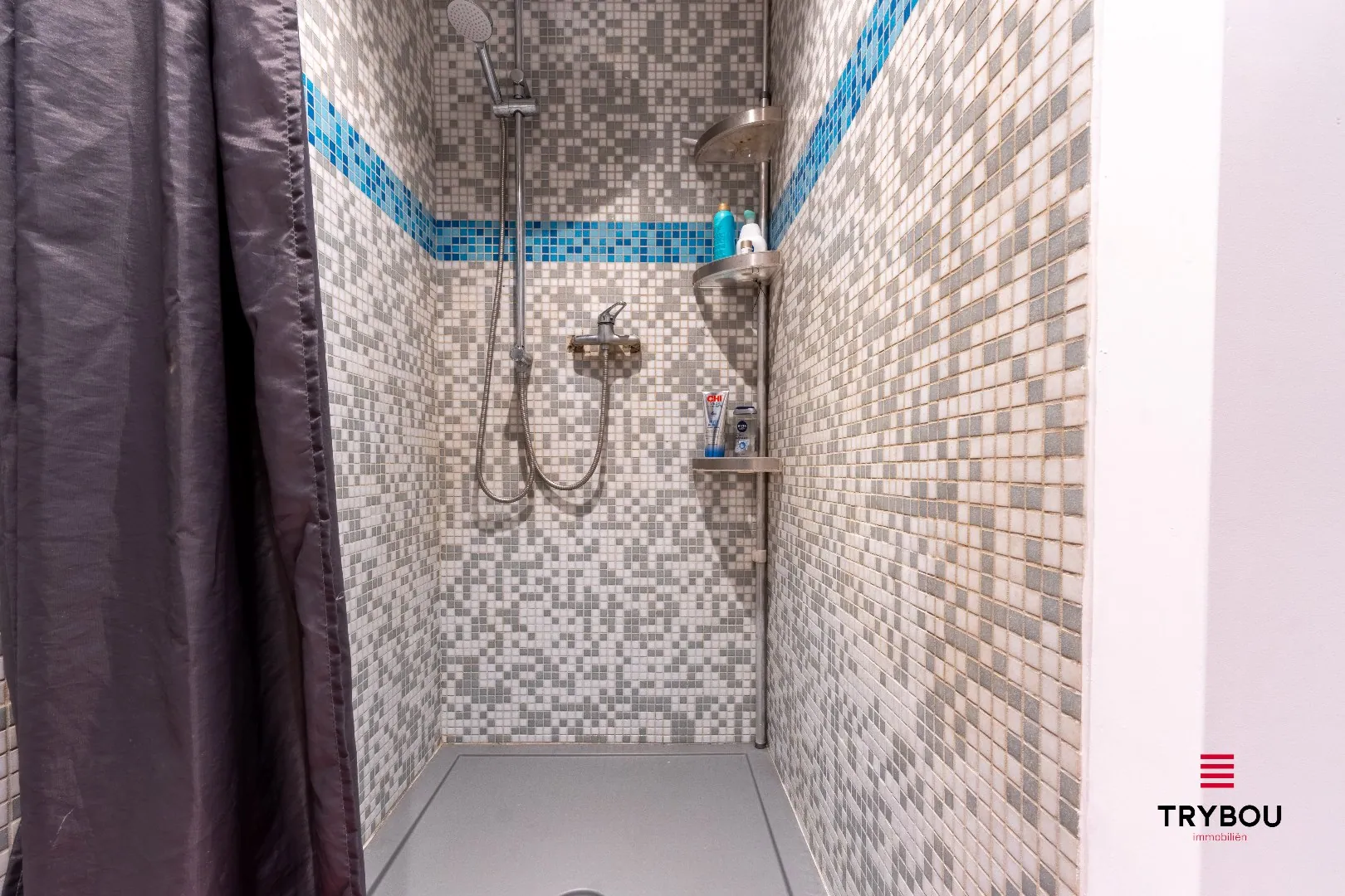 Verder kom je in de open leefruimte, waar de zithoek, eetplaats en volledig uitgeruste keuken naadloos in elkaar overvloeien. Grote raampartijen zorgen voor veel natuurlijk licht en een aangename connectie met de tuin. De badkamer op het gelijkvloers is praktisch ingericht met een ligbad, aparte douche, toilet en lavabo.